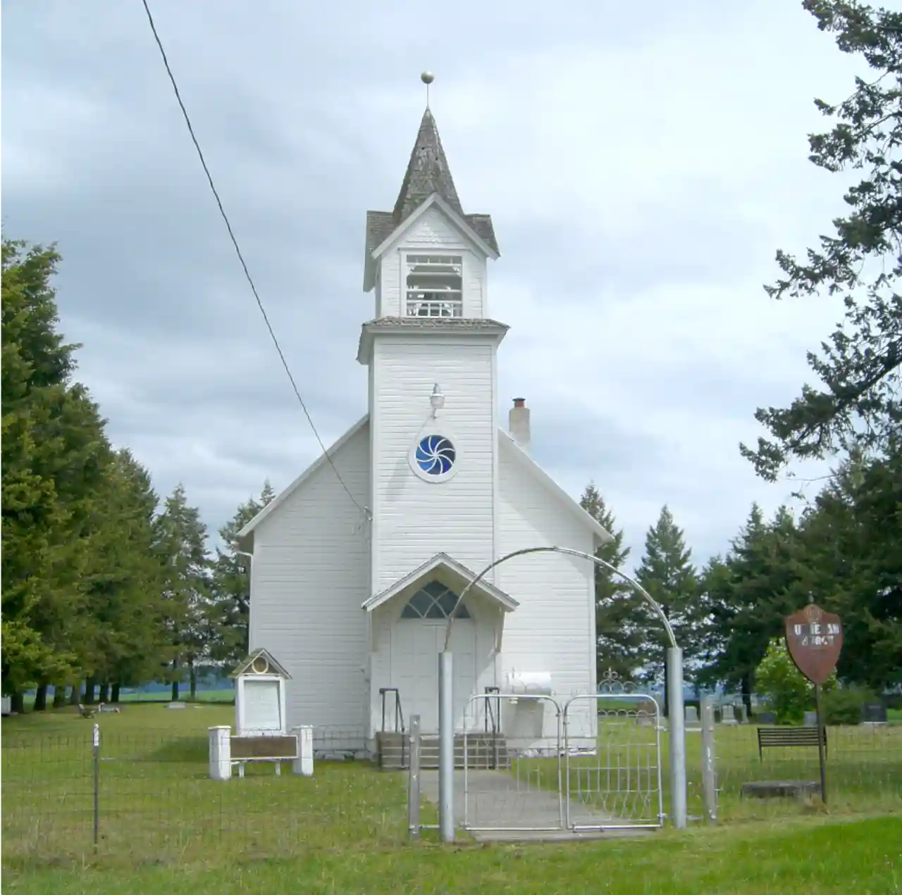 Bethany Memorial Chapel was built by Norwegian homesteaders who settled in the Big Bear Ridge area north of Kendrick in rural Latah County, Idaho. Norwegians who had settled in the area met at the home of Edward Dahl on July 21, 1902, for the purpose of organizing a Lutheran church in the area. In late July 1902, plans were prepared for the building, which was to be constructed on one-half acre of land promised by Edward Jones. However, Jones had sold his land to Halvor Nelson, who then added another one-half acre to the property. Construction of the Carpenter Gothic building began in 1905 and was completed, inside and out, in 1908. Although the interior of the building had not yet been completed, the first service in the church took place on December 26, 1905, when Halvor Lien married Hilda Slind. The pews, altar railing, and pulpit were carved by Eric Leien, a member of the congregation. It was originally named the Evangelical Lutheran Church, Bethany Congregation of Kendrick. There is no longer an active congregation holding services, but the church and cemetery are maintained by community members. Read more on Wikipedia