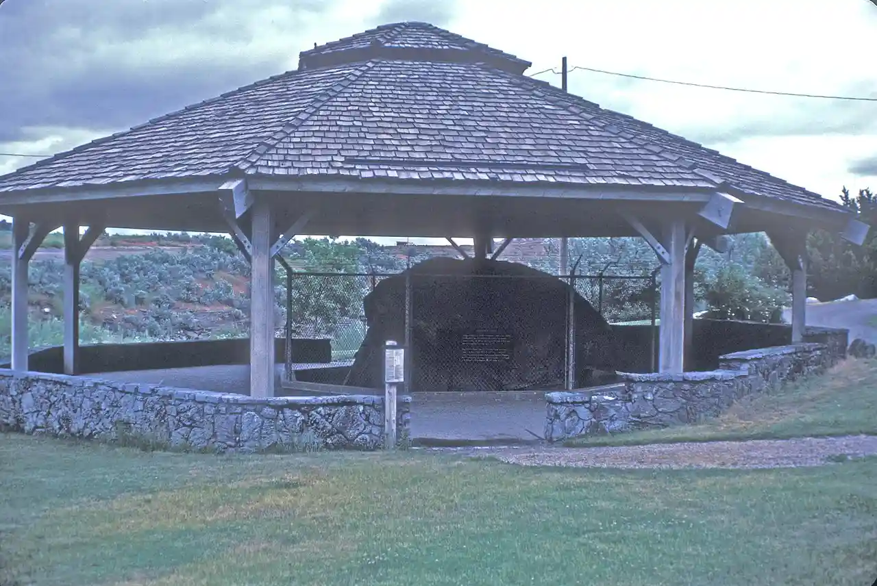 Register Rock, near American Falls, Idaho, is a historic site where many Oregon Trail emigrants carved their names on a rock. The rock is located in what is now Massacre Rocks State Park and is now protected by a shelter. Read more on Wikipedia