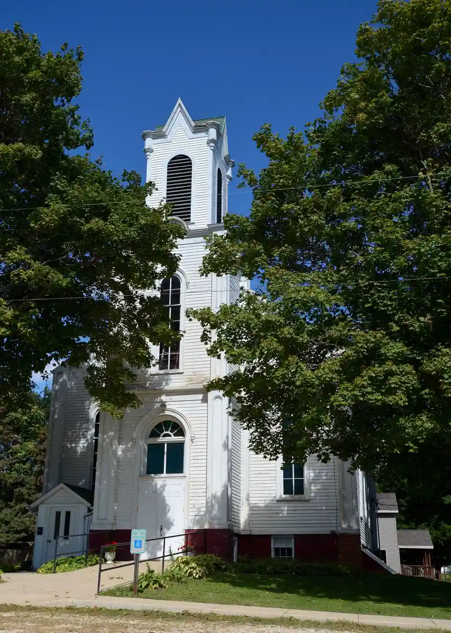 The First Congregational Church of LaMoille is a historic church located at 94 Franklin Street in La Moille, Illinois, United States. The building was constructed in 1867 for La Moille's Congregational church, which was established by Owen Lovejoy in 1840. The church was designed in the Italianate style, which was growing in popularity at the time. Its design features tall arched windows, a tower atop the main entrance, decorative pilasters at the corners, and corbelling along the front cornice. The church originally included several Gothic Revival features as well, such as a spire steeple and pinnacles, but these fell into disrepair and were removed. Read more on Wikipedia