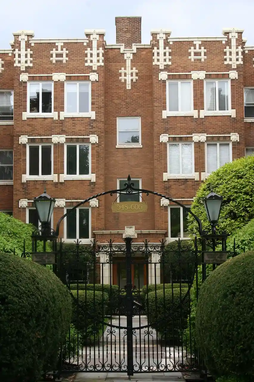 The Building at 548–606 Michigan Avenue is a historic building in Evanston, Illinois. The three-story brown brick building was built in 1924. Architect N. Hilton Smith designed the building, which incorporates elements of Gothic and Prairie School architecture. The building's design features geometric themes, projecting bays, terra cotta detailing, and a brick parapet. The building encircles a recessed courtyard with a wrought iron gate and multicolored stone paths. Read more on Wikipedia