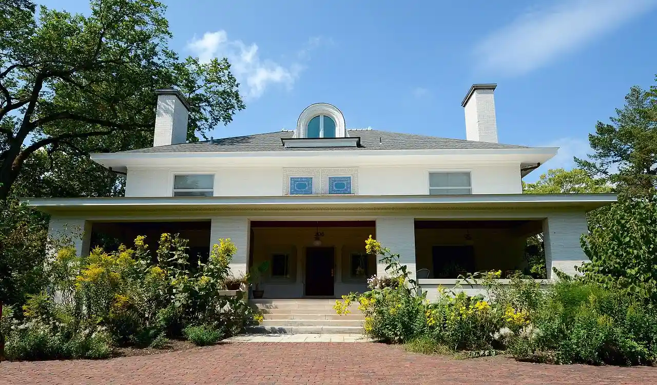 The William and Helen Coffeen House is a historic house located at 306 S. Garfield Street in Hinsdale, Illinois. Built in 1899–1900, the house is an early example of architect George W. Maher's Prairie School work. The house has a stucco exterior, a building material that ultimately became a distinctive element of Maher's work. The decorative wooden frame around the house's entrance and the extensive use of stained glass windows highlight how Maher developed a distinctive personal style of ornamentation in his designs. The house's original owners were real estate agent William Coffeen and his wife Helen, both of whom were active members of Hinsdale's civic and social life. Read more on Wikipedia