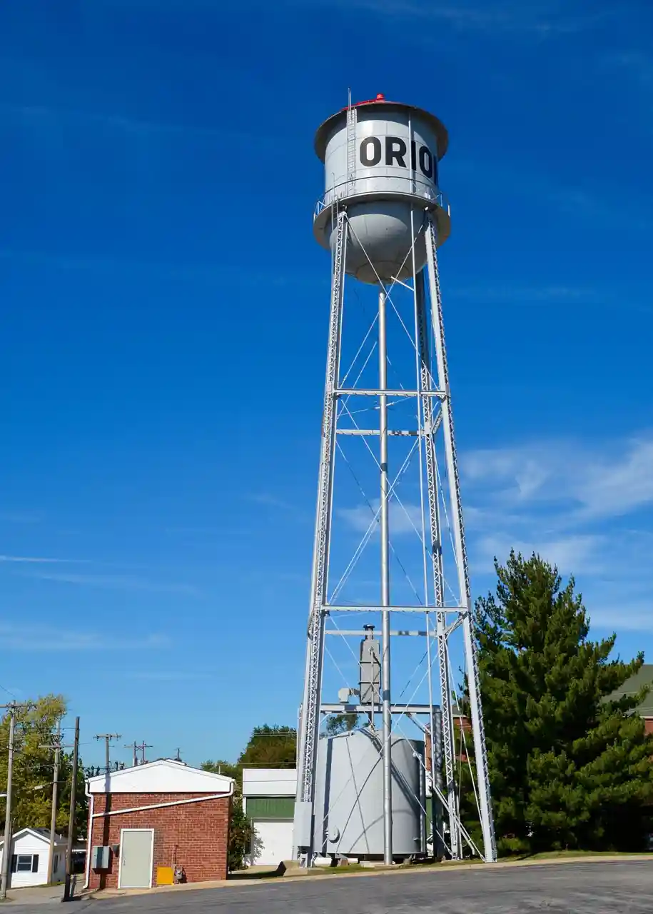 The West Water Tower and Ground Storage Tank are a historic water tower and storage tank located at 310 11th Avenue in Orion, Illinois. The tower and tank were built in 1928 as part of the village's new water system, which had been approved the previous year. The water system was introduced both as a response to several fires which had plagued the village and as an effort to bring modern technology and progress, among other civic concerns. The water tower consists of a steel tank with a hemispherical bottom supported by a steel trestle; the structure is tall. The ground storage tank, located at the base of the tower, is made of redwood and holds of water. Read more on Wikipedia
