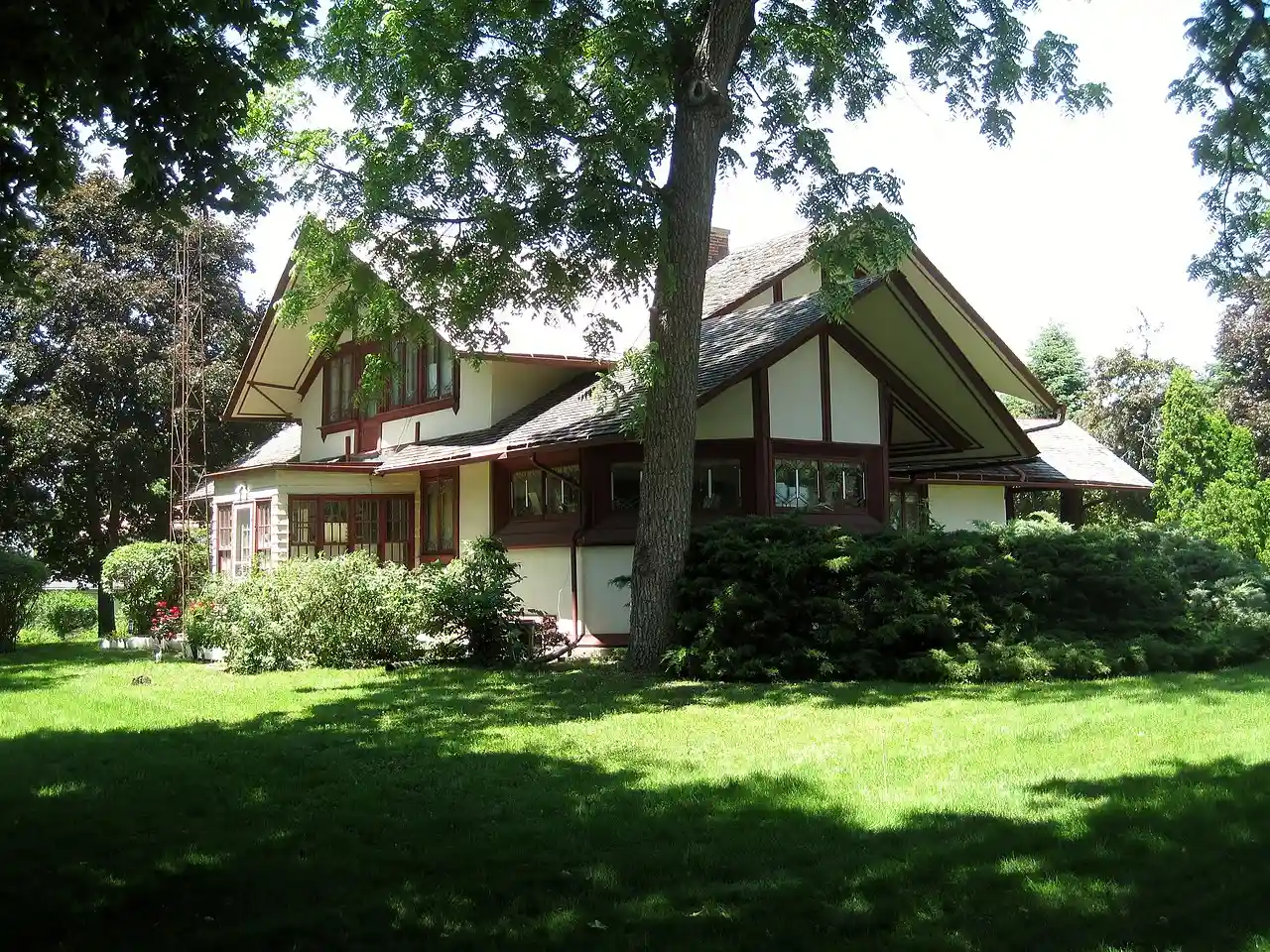 The Warren Hickox House, also known as the Hickox/Brown house, is a 1900 Frank Lloyd Wright house in the Prairie School style in Kankakee, Illinois, United States. The house design is similar to two articles Wright published in the Ladies' Home Journal. Read more on Wikipedia