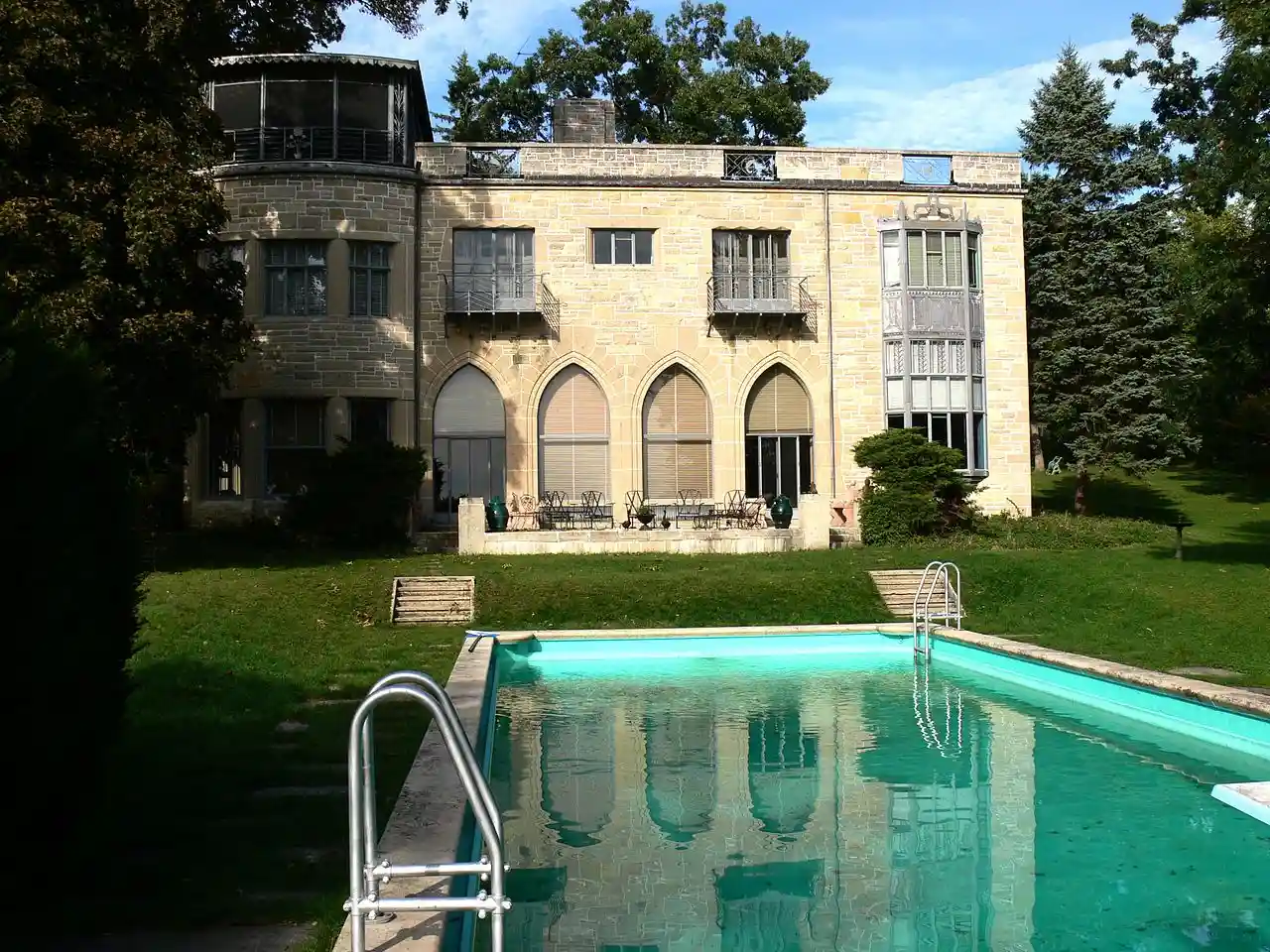 The David Hall House is a historic house at 25420 W. Cedar Crest Lane in Lake Villa, Illinois. The house was built in 1931 for David and May Cave Hall, a wealthy couple who settled in Lake Villa after taking summer vacations there for many years. Architect Ralph Wesley Varney designed the building in the Art Deco with elements of popular revival styles of the period. An unusual choice for a residential building, the use of Art Deco was likely inspired by May's travels to Hollywood in the 1920s. The house's design includes a rusticated limestone exterior, large Gothic arch windows, a triangular canopy above the entrance, a metal oriel window, and a stepped roof. Its grounds include a swimming pool and terrace garden. Read more on Wikipedia