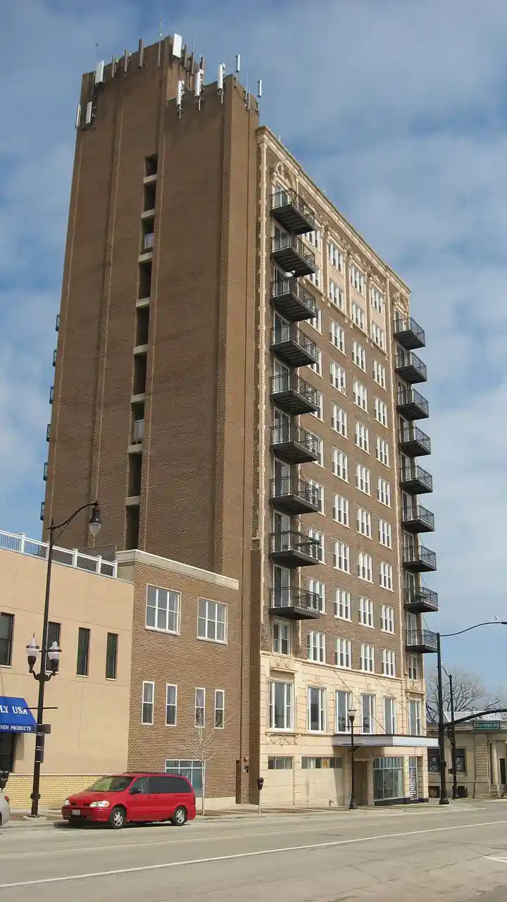 The Hotel Waukegan is a historic hotel building located at 102 Washington Street in Waukegan, Illinois. At an original height of 12 stories and , the hotel is the tallest building in the city. Its architecture is primarily Renaissance Revival but incorporates a variety of styles; its decorative elements include elaborate terra cotta details on the upper and lower stories and quoin-like terra cotta at its corners. The hotel opened in 1927 during a population and economic boom in Waukegan; it is the better-preserved of the city's two surviving hotels from this period. While the hotel struggled financially in its early years, it stabilized in the 1930s; from then on, it served as both a modern hotel for travelers and laborers and a meeting place for community events. Read more on Wikipedia