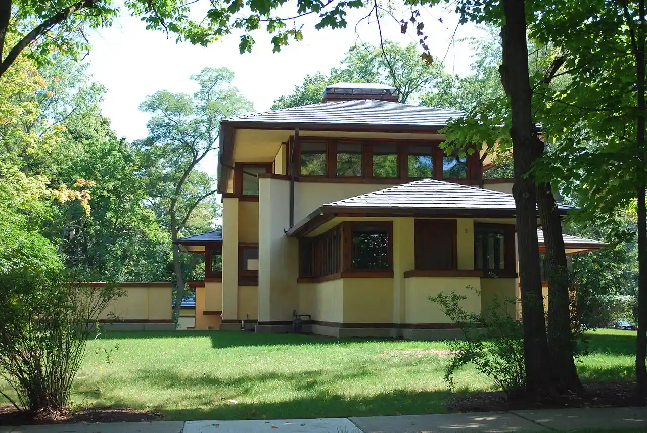 The 1905 Mary W. Adams House, is a Frank Lloyd Wright designed Prairie School home that was constructed in Highland Park, Illinois. The Adams House is a two-story home with three bedrooms and two bathrooms with a light stucco exterior and wooden trim that emphasizes the horizontal. Read more on Wikipedia