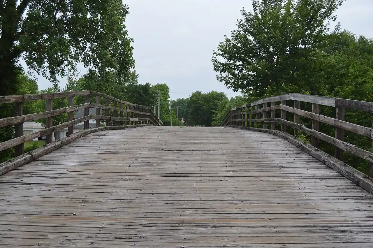 The Bridge at 13th Street, also known as the Wooden Bridge, is a historic bridge in St. Francisville, Illinois that carries 13th Street across a former railroad right-of way. The bridge was built in 1909 as a safer crossing of the railroad; at the time, the railroad was operated by the Cairo, Vincennes and Chicago Railway, a division of the Cleveland, Cincinnati, Chicago and St. Louis Railway (Big Four). The railroad paid for the bridge according to its contract with the city, which had passed a city council resolution compelling the railroad to fulfill this portion of the contract two years earlier. The bridge is a beam bridge built partly of timber and partly of steel, though it is possible that its steel beam was added after its completion. At long with a main span, the bridge is relatively long compared to other surviving timber bridges in Illinois. Read more on Wikipedia