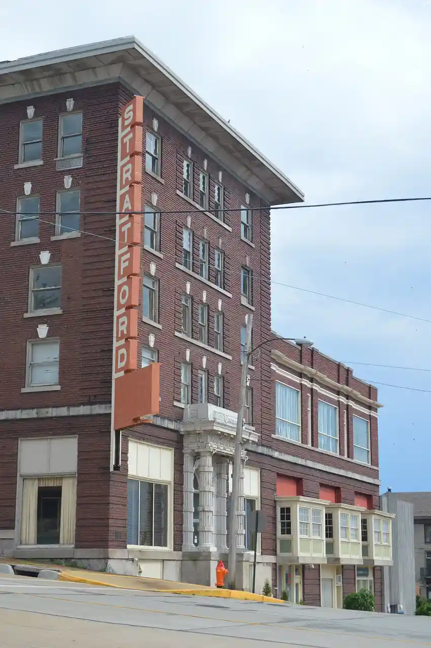 The Hotel Stratford is a historic hotel located at 229 Market St. in Alton, Illinois. The hotel, originally known as the Illini Hotel, opened in 1909. St. Louis architectural firm Barnett, Haynes & Barnett designed the hotel in the Classical Revival style. The five-story brick building features brick quoins, limestone bands and window sills, terra cotta ornamentation, and a cantilevered cornice. The hotel opened a rooftop garden in 1910 and a reception room in 1912, and it became one of many hotels which drew conventions to Alton; a contemporary newspaper account described the building as part of the "greatest improvement in property in the city of Alton". In 1925, new owner E. J. Lockyer renamed the hotel to its current name. The hotel is the only hotel built in Alton before 1950 that is still in operation. Read more on Wikipedia