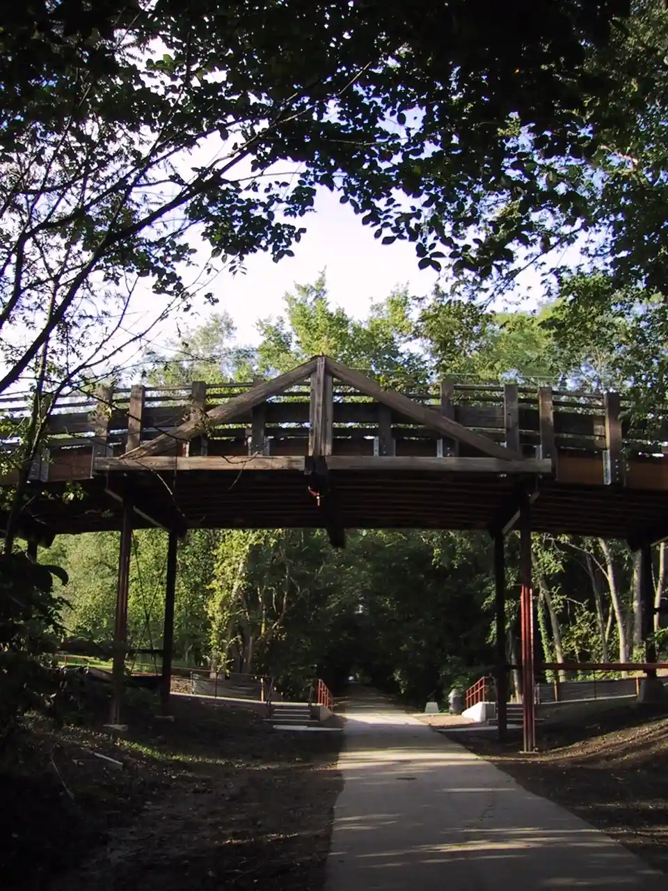 The Camelback Bridge is a restored historic wooden bridge that arches over the Constitution Trail in Normal, Illinois. It is on the U.S. National Register of Historic Places. The bridge's main span is a wooden kingpost pony truss. The bridge is supported by Phoenix columns, a type of wrought iron column that was patented by the Phoenix Iron Company in 1862. It is one of only two bridges in Illinois using the columns. Read more on Wikipedia