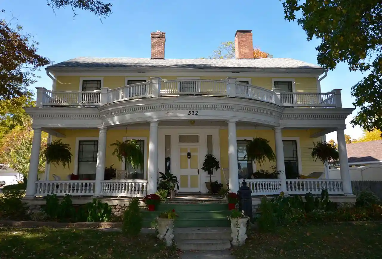 The Freeman-Brewer-Sawyer House is a historic house in Hillsboro, Illinois. The Greek Revival house was built in 1840, during the height of the style's popularity in the United States. The two-story house features six-over-six windows and a front entrance framed by pilasters, sidelights, and a transom; in addition, it originally had a portico supported by Doric columns. In 1904, the portico was replaced by a Classical Revival porch; the rounded, projecting porch features a balustrade along its roof, egg-and-dart molding, dentillation, and urn-shaped finials. Read more on Wikipedia