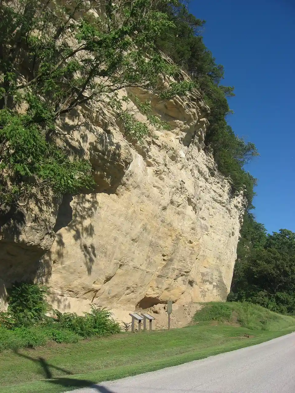 The Modoc Rock Shelter is a rock shelter or overhang located beneath the sandstone bluffs that form the eastern border of the Mississippi River floodplain at which Native American peoples lived for thousands of years. This site is significant for its archaeological evidence of thousands of years of human habitation during the Archaic period in the Eastern United States. It is located on the northeastern side of County Road 7 (Bluff Road) southeast of Prairie du Rocher in Randolph County, Illinois, United States. It was declared a National Historic Landmark in 1961. Read more on Wikipedia