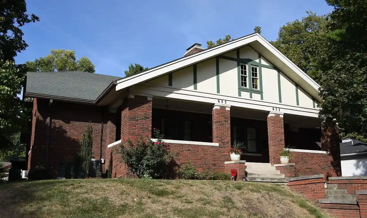 The Heimberger House is a historic house located at 653-655 West Vine Street in Springfield, Illinois. The two-family house was built in 1915; it was designed to resemble a single-family house to blend in with the surrounding neighborhood. Harry Jasper Reiger designed the Arts and Crafts style bungalow. The house has a characteristic low-pitched Craftsman roof with exposed rafters, wide eaves, and clipped gables. Skylights in the roof let natural light into the interior rooms, an uncommon feature for a Craftsman bungalow. The front porch is covered by a large half-timbered gable and features ornamental tiling. Read more on Wikipedia