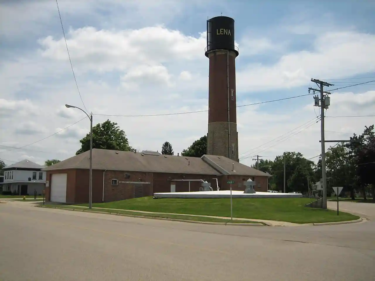 The Lena Water Tower is a water tower located in the village of Lena, Illinois, United States. It was built in 1896 following two decades of problems with structure fires in the village. The current water tower is the result of a second attempt after the first structure proved to be unstable. The tower stands tall and is built of limestone and red brick. The current stainless steel water tank holds 50,000 gallons (190,000 liters) and replaced the original wooden tank in 1984. The site has two other structures, an old power plant building and a 100,000 US gallon (380,000 L) reservoir. The Lena Electric Plant Building was constructed in 1905 and the reservoir completed in 1907. The Lena Water Tower was listed on the U.S. National Register of Historic Places in 1997; the reservoir was included as a contributing property to the listing. Read more on Wikipedia