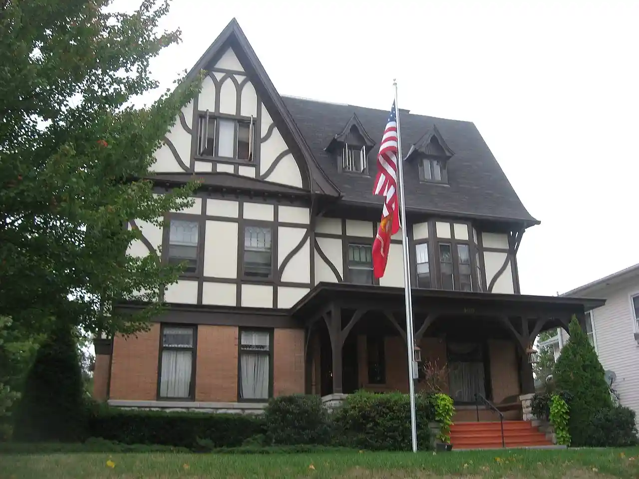 The William S. Weir Jr. House is a historic house located at 402 East Broadway in Monmouth, Illinois. The house was built in 1894 for William S. Weir Jr. a local investor and businessman. Weir began selling plows and cultivators of his own invention in the 1860s, and his company had become nationally recognized and a major financial success by the time he sold his ownership interest in 1886. Weir continued to innovate in the locally prominent stoneware and pottery industry and invested in the development of the nearby village of Alexis. Weir's house has a Tudor Revival design with ornamental half-timbering in the front, a steep cross gabled roof, and groups of windows with decorative multi-pane glasswork. Read more on Wikipedia