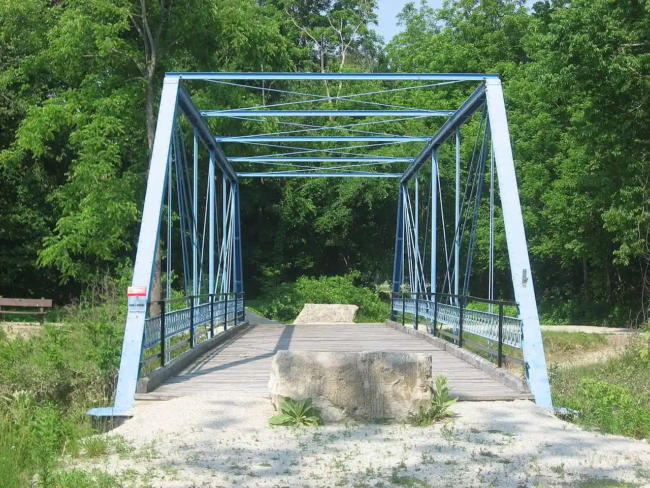 Pulaski County Bridge No. 31 (also known as the Stearns Truss Bridge or the Blue Bridge) is a Stearns Truss Bridge originally built in 1905 in Pulaski County in the U.S. state of Indiana. In 2006, it was disassembled at its location over Big Monon Ditch, near Medaryville in Pulaski County, and moved to the Wabash and Erie Canal park in Delphi in Carroll County, Indiana. It was added to the National Register of Historic Places (NRHP) in 2003, thanks to the efforts of a local Boy Scout. It is believed to be the last surviving Stearns Truss Bridge in the United States. Read more on Wikipedia