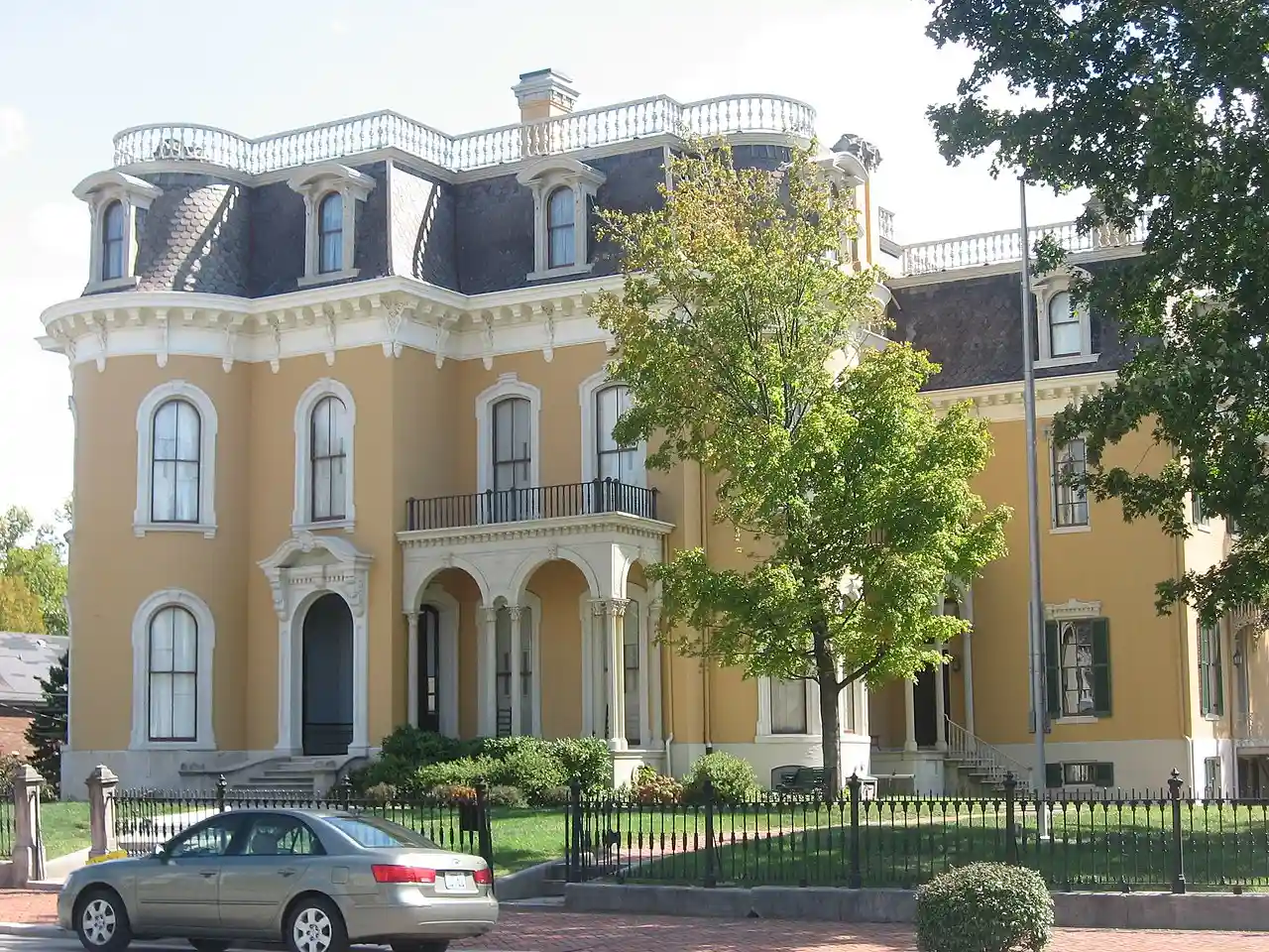 Culbertson Mansion State Historic Site is located in New Albany, Indiana by the Ohio River. It was the home of William Culbertson, who was once the richest man in Indiana. Built in 1867 at a cost of $120,000, this Second Empire-style mansion has 25-rooms within , and was completed in November 1869. It was designed by James T. Banes, a local architect. Features within the three-story edifice include hand-painted ceilings and walls, frescoed ceilings, carved rosewood-grained staircase, marble fireplaces, wallpaper of fabric-quality, and crystal chandeliers. The original tin roof was imported from Scotland. The displays within the mansion feature the Culbertson family and the restoration of the building. The rooms on the tour are the formal parlors, dining rooms, bedrooms, kitchen, and laundry room. Note: This includes and Accompanying photographs. Read more on Wikipedia