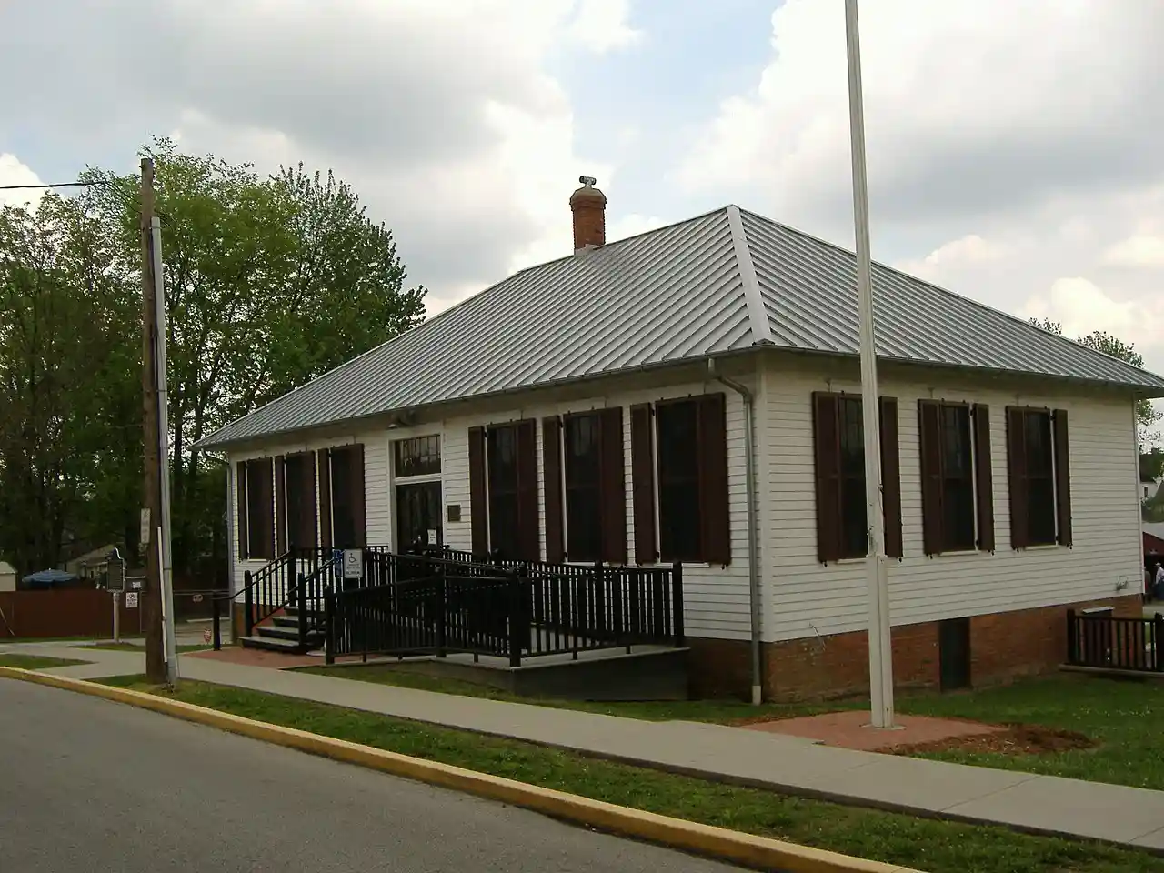The Division Street School is a historic school building located at New Albany, Floyd County, Indiana. It was one of the first elementary schools for African-American children, with construction beginning in June 1884, and the opening in 1885. It was moved by thirty feet westward in 1922. It was untouched by the Ohio River flood of 1937. It operated as a school until May 1946, while segregation still took place; those students still attended were assigned to Griffin Street School. From 1946 until 1948 it was a Veterans Administration Office. It was then used as a maintenance shop for the New Albany/Floyd County School Corporation until 1999. After restoration, it is now used for various community activities. Note: This includes and Accompanying photographs, Newspaper Article, Supporting Documentation, and Letter. Read more on Wikipedia