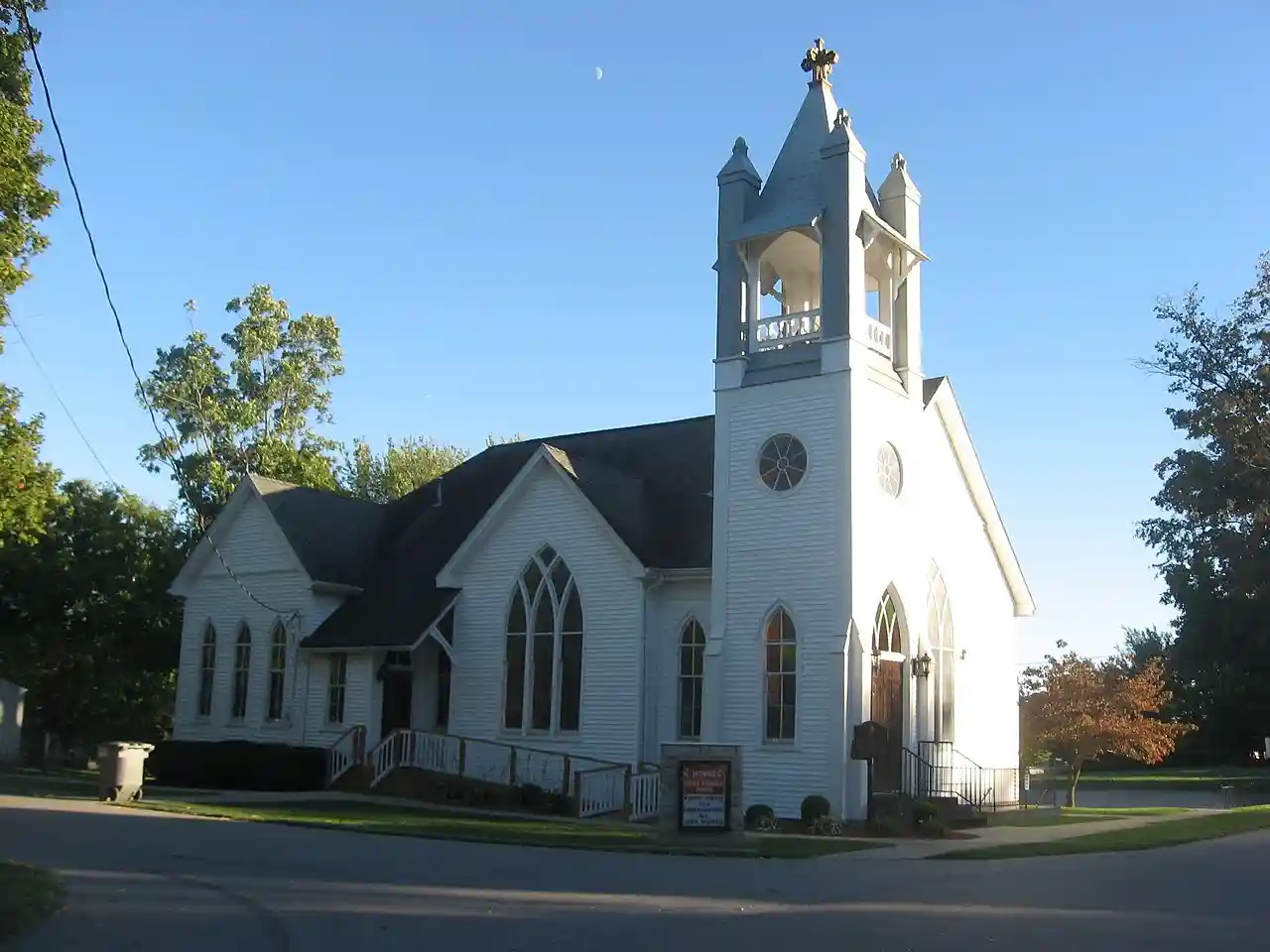 The Simpson Memorial United Methodist Church is a historic United Methodist church located at Greenville, Floyd County, Indiana. It was designed by church plan catalogue architect Benjamin D. Price and built by Capt. John Nafius in 1899. It is a frame Gothic Revival style church built on the Akron Plan and topped by a hipped and gable roof. It features lancet windows and a corner bell tower topped with four square piers sheathed in tin. Note: This includes and Accompanying photographs.(includes photograph) Read more on Wikipedia