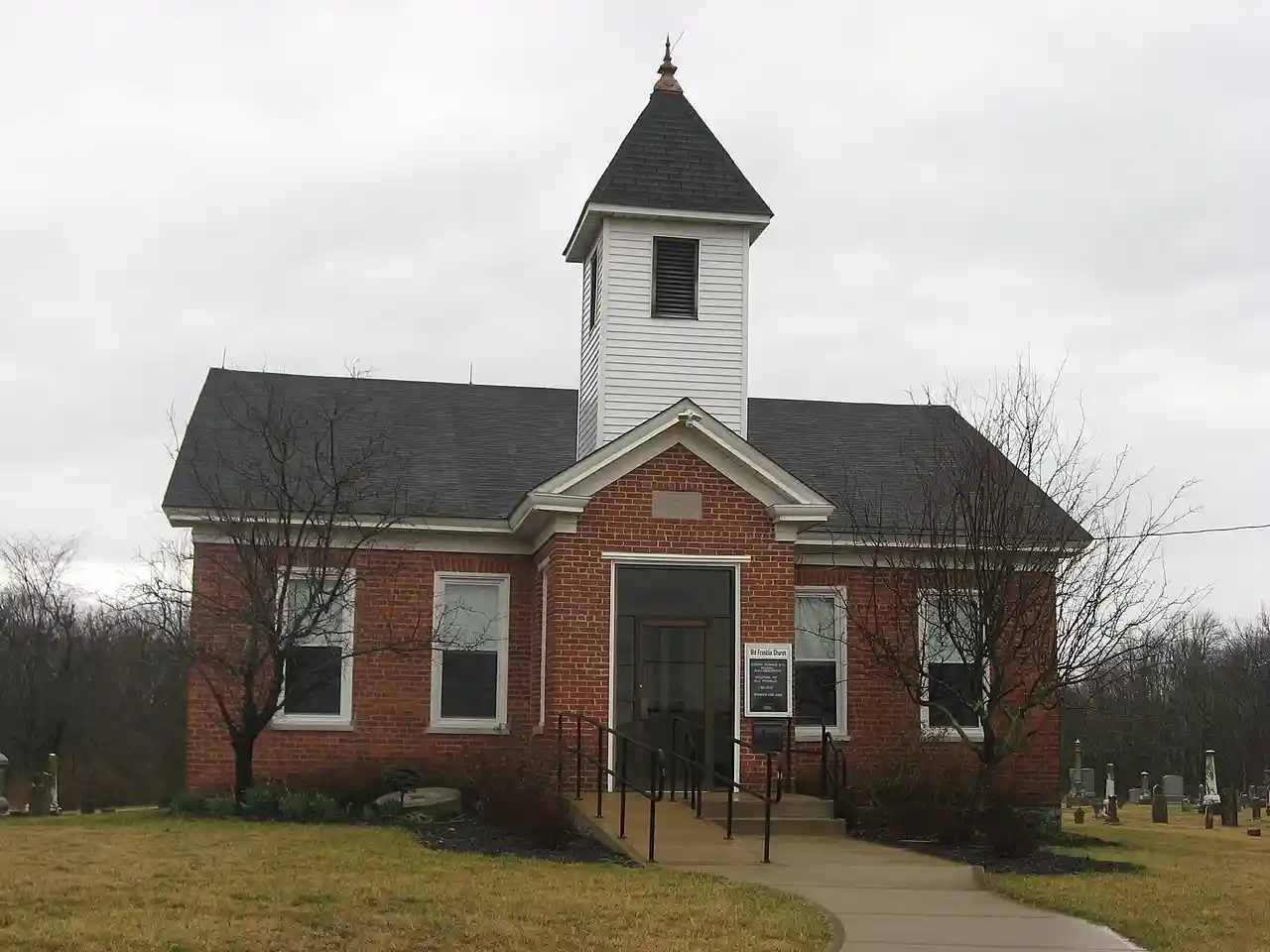 Old Franklin United Brethren Church, now known as Old Franklin Community Christian Church, is a historic United Brethren church located at Fairfield Township, Franklin County, Indiana. It was built in 1831, and is a one-story, five-bay, Federal style brick building. It has a central cross gable at the vestibule topped by a bell tower and steeple added in 1910. Surrounding the church on three sides is a cemetery with gravestones dating to the 1830s and 1840s. Note: This includes and Accompanying photographs. Read more on Wikipedia