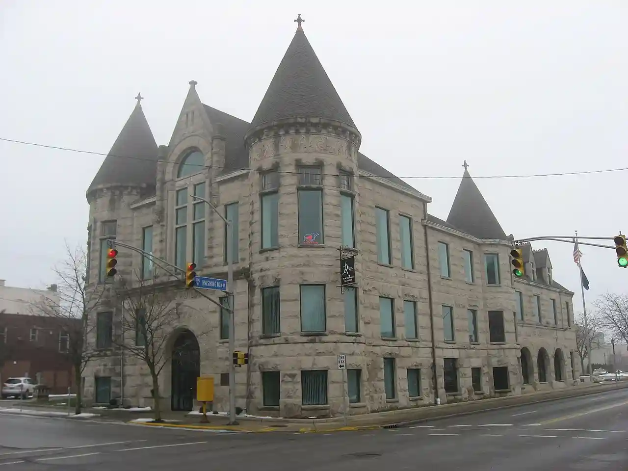 Kokomo City Building is a historic municipal building located at Kokomo, Indiana. It was designed by the architecture firm of Wing & Mahurin and built about 1893. It is a two-story, Richardsonian Romanesque style brick and limestone building on a raised basement. It features rounded corner towers topped by conical roofs and a central stone arch entrance. In the rear (Southwest corner) of the building is the former fire station used until 1979. Note: This includes and Accompanying photographs. Read more on Wikipedia