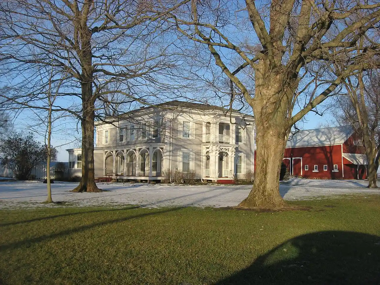 Hall Farm is a historic home and farm located in Prairie Township, Kosciusko County, Indiana. The house was built in 1871, and is a two-story, three-bay, Italianate style frame dwelling. It is topped by a low pitched hipped roof. The front facade features a two-story, one-bay portico with elaborate brackets and scrollwork. Also on the property is a contributing timber frame English barn (c. 1871). Note: This includes and Accompanying photographs. Read more on Wikipedia