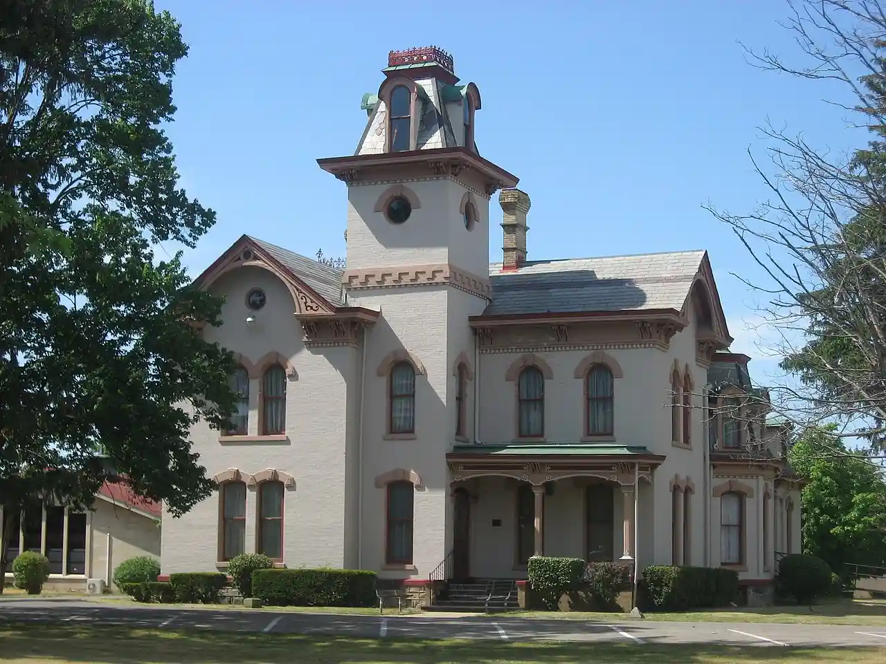 John Badlam Howe Mansion is a historic home located on the grounds of Howe Military School, in Howe, Lima Township, LaGrange County, Indiana. It was built in 1875–1876, and is a two-story, Italianate style white brick building trimmed with stone and terra cotta. It measures 51 feet by 78 feet, and features a three-story, central tower with a Second Empire style mansard roof. Note: This includes and Accompanying photographs. Read more on Wikipedia
