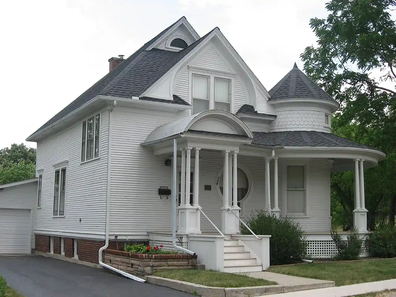 J. Claude Rumsey House, also known as the Rumsey-Nomanson House, is a historic home located at 709 Michigan Avenue in Lowell, Lake County, Indiana. It was built in 1906, and is a 2-story, Queen Anne stick built home with a cross-gable roof. It sits on a concrete foundation, which was quite modern at the time, and features a round corner tower with fishscale shingles and a wraparound porch. Note: This includes and Accompanying photographs. Read more on Wikipedia