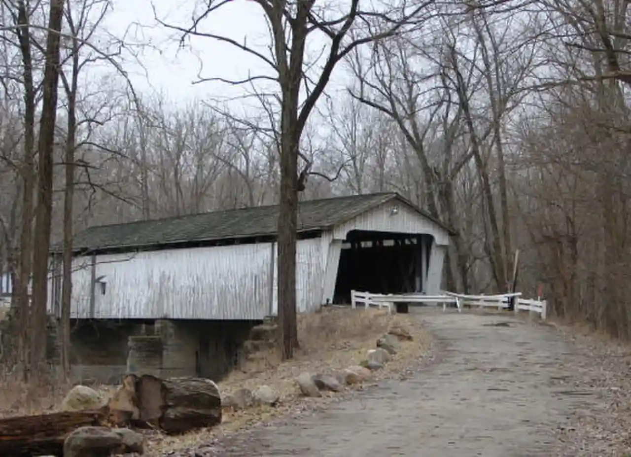 Darlington Covered Bridge is a historic covered bridge located in Franklin Township, Montgomery County, Indiana. It was built in 1868, and is a single span, Howe truss covered bridge that spans Sugar Creek. It measures 166 feet long and has an overall width of 22 feet. Note: This includes and Accompanying photographs. Read more on Wikipedia