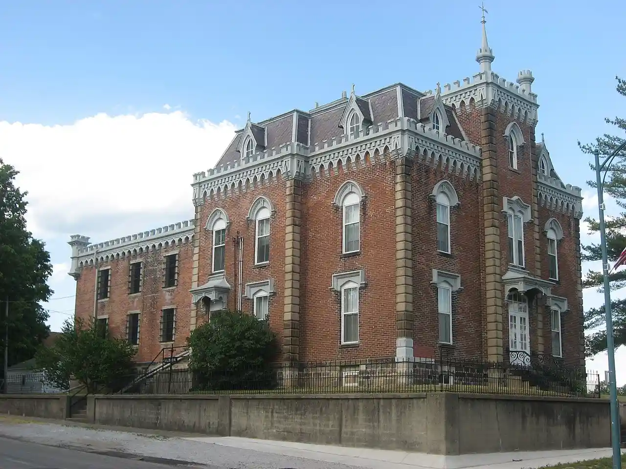 The Noble County Sheriff's House and Jail, also known as the Old Jail Museum, is a historic jail and residence located in Albion, Noble County, Indiana. It was built in 1875 by Thomas J. Tolan and Son, Architects of Fort Wayne, Indiana. It is a -story, red brick building with combined Second Empire and Gothic Revival style design elements. It features round-arched windows, a three-story projecting entrance tower, and a mansard roof. Note: This includes and Accompanying photographs. Read more on Wikipedia