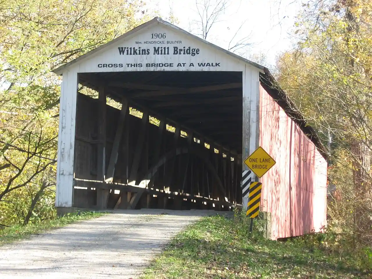 The Wilkins Mill Covered Bridge is north of Rockville, Indiana, United States. The single span Burr Arch Truss covered bridge structure was built by William Hendricks in 1906. The bridge is long, wide, and high. Note: This includes , Site map, and Accompanying photographs. Read more on Wikipedia
