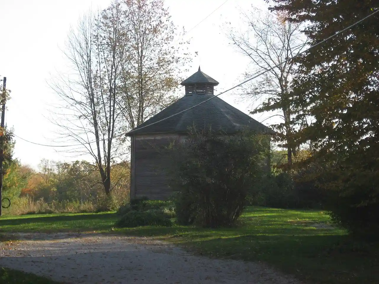 William Hill Polygonal Barn, also known as the Hill-Mershon Barn, is an eight-sided barn located at Bloomingdale, Parke County, Indiana. It was built about 1905, and is a two-story, octagonal frame building. It measures 30 feet in width and is topped by a sectional cone roof topped by an octagonal cupola. Note: This includes and Accompanying photographs. Read more on Wikipedia
