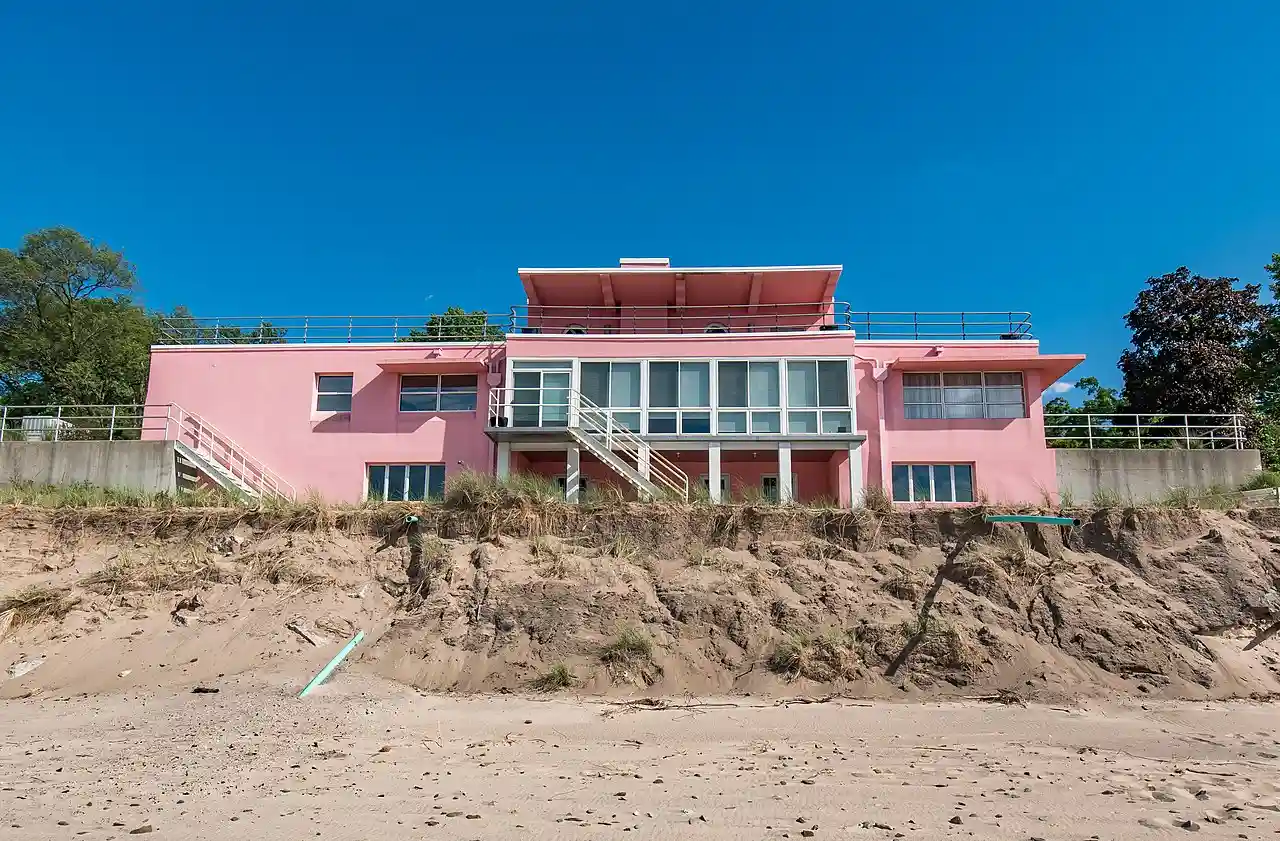 The Florida Tropical House is a beach house located on Lake Michigan's shoreline in Beverly Shores, Indiana, US. It was built in 1933 as part of the Homes of Tomorrow Exhibition at the 1933 World's Fair in nearby Chicago. Today it is part of the Century of Progress Architectural District, a historic district. Read more on Wikipedia