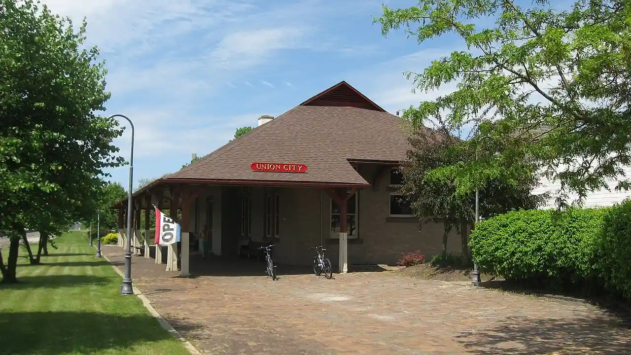 Union City is a historic train station located at Union City, Randolph County, Indiana. It was built in 1876, and is a one-story, rectangular, brick building with limestone trim. It measures 92 feet long and has a modified hipped roof. The building features wide overhanging eaves in the Prairie School style and Stick Style / Eastlake movement influences. It was remodeled between 1925 and 1930. Note: This includes and Accompanying photographs. Read more on Wikipedia