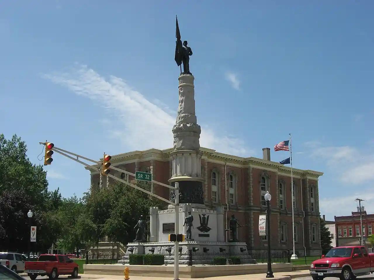 Winchester Courthouse Square Historic District is a national historic district located at Winchester, Randolph County, Indiana. The district encompasses 52 contributing buildings and 10 contributing structures in the central business district of Winchester. The district developed between about 1875 and 1950 and includes notable examples of Italianate, Romanesque Revival, and Classical Revival style architecture. Notable buildings include the Randolph County Courthouse (1875), U.S. Post Office (1932), I.O.O.F. Hall (c. 1875), Winchester Community Library (1906), Masonic Lodge (c. 1925), Randolph Hotel (c. 1910), David Building (1927), and W.E. Miller Department Store (1883). Notable structures include the "Spirit of the Doughboy" monument (1928), Lamp of Freedom (c. 1950), Soldiers and Sailors monument (1892), and Laredo Taft Marker (c. 1936). Note: This includes and Accompanying photographs. Read more on Wikipedia