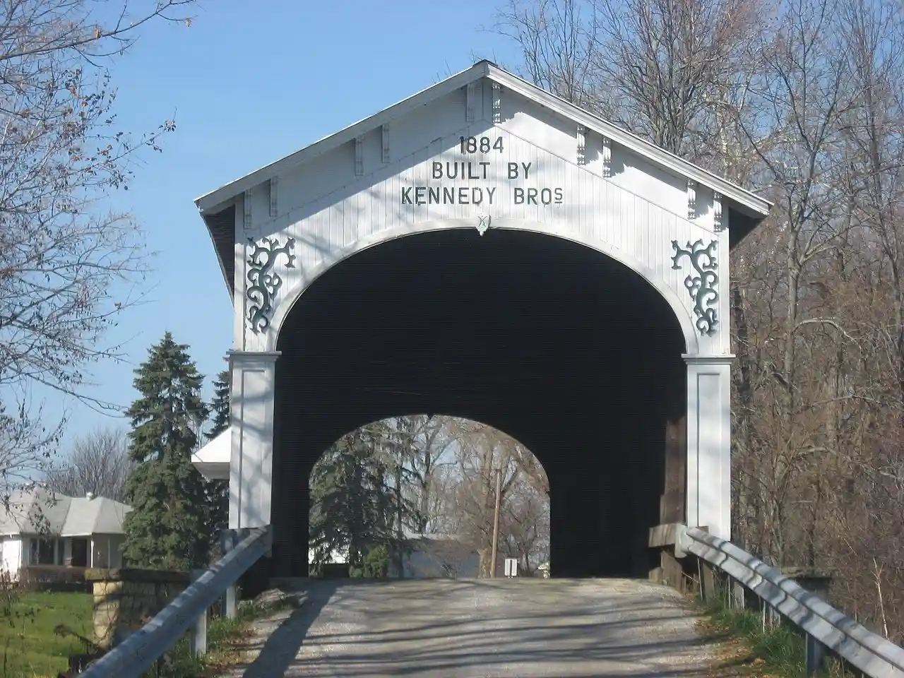 Offutt Covered Bridge is a historic covered bridge located near Rushville, Indiana in Posey Township, Rush County, Indiana. It was built in 1884 by Emmett L. Kennedy and his brother Charles. It is a Burr Arch bridge, long over the Little Blue River. The bridge has rounded arch portals and decorative scrollwork that are signatures of the Kennedy firm. Note: This includes and Accompanying photographs. Read more on Wikipedia