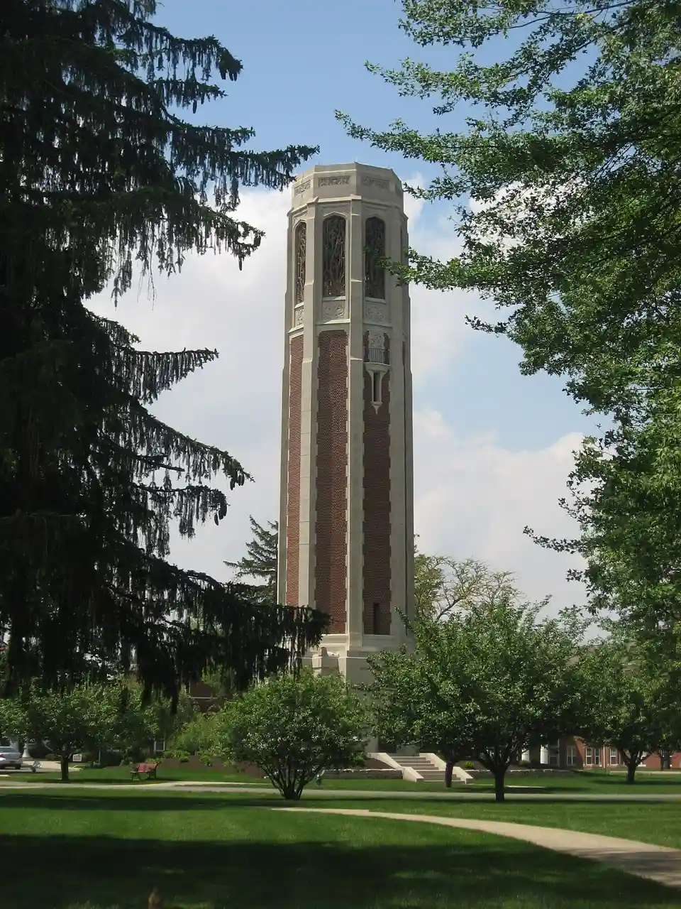 Peabody Memorial Tower, also known as the Singing Tower, is a historic structure located at North Manchester, Wabash County, Indiana. It was designed by architect Charles R. Weatherhogg and built in 1937. The structure consists of a cube shaped limestone mausoleum at the base topped by a brick and limestone carillon that reaches 110 feet tall. It has streamlined Art Deco character with Tudor Revival features. Note: This includes and Accompanying photographs Read more on Wikipedia