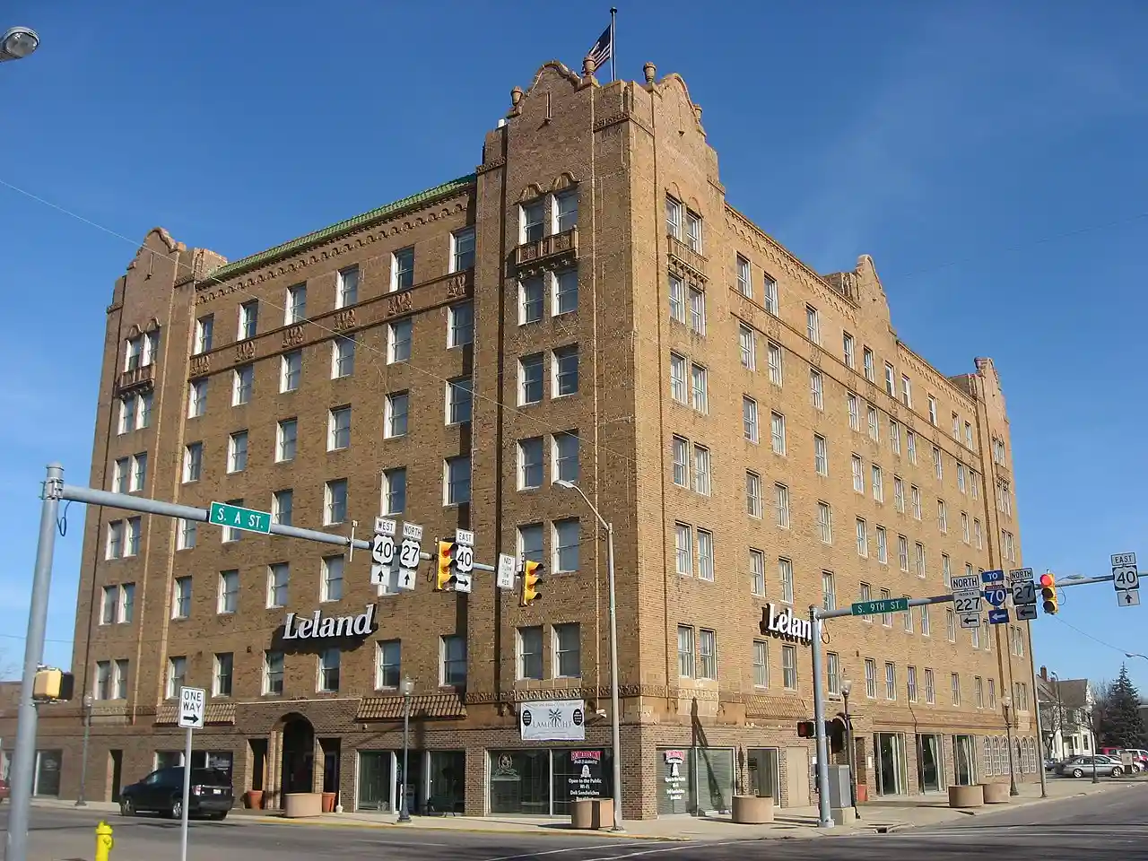 Leland Hotel, also known as the Leland Motor Inn, is a historic hotel building located at Richmond, Wayne County, Indiana. It was built in 1928, and is a seven-story, U-shaped, Mission Revival style reinforced concrete building sheathed in light brown brick dwelling. The building was modernized in the mid-1960s and removed or covered many of the original details. It is the tallest building in Richmond. Note: This includes and Accompanying photographs Read more on Wikipedia