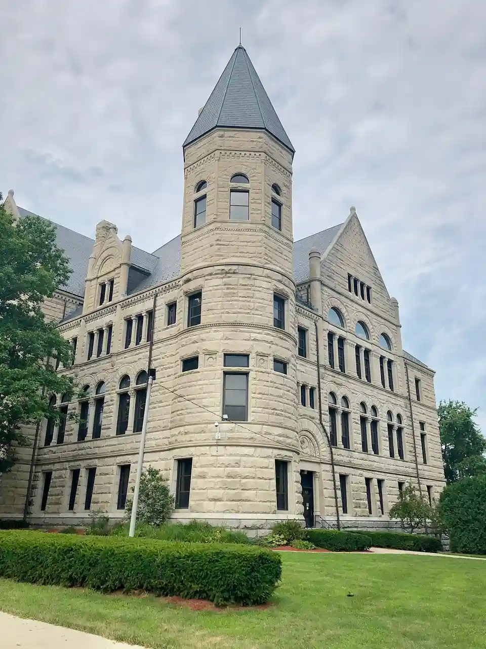 The Wayne County Courthouse is a historic courthouse located in Richmond, Wayne County, Indiana. It was built during the period 1890–93, and is in the Richardsonian Romanesque style. The building was designed by Cincinnati, Ohio, architect James W. McLaughlin and the construction was supervised by New Castle, Indiana, architect William S. Kaufman. The U-shaped building measures approximately 214 feet by 128 feet, and is constructed of brick faced with Indiana Limestone. It features a projecting entrance pavilion, high pitched hipped and gable roofs, large semicircular arches, and octagonal corner tower. Note: This includes and Accompanying photographs Architectural historians Michael Tomlan and Mary Raddant-Tomlan have suggested that the Wayne County Courthouse was influenced both in terms of exterior design and elements of interior layout by Henry Hobson Richardson's Allegheny County Courthouse in Pittsburgh, Pennsylvania. Read more on Wikipedia
