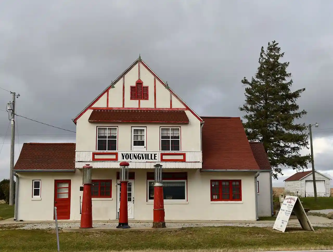 Youngville Cafe, also known as Youngville Station, is a historic building located northwest of Watkins, Iowa, United States. It was a one-stop roadside business that included a café, a Skelly gas station, and three cabins for travelers to stay in. The cabins have subsequently been removed. The building calls attention to increasing business opportunities for women. with The Tudor Revival building was built in 1931 by Joe Young on his pasture land for his widowed daughter Lizzie Wheeler to support her and her children. The main building also contained residential space where the family lived. It is located on U.S. Route 30, which at this point had been the Lincoln Highway. The café/station also served as a bus depot for the Greyhound and Jefferson bus lines. Read more on Wikipedia