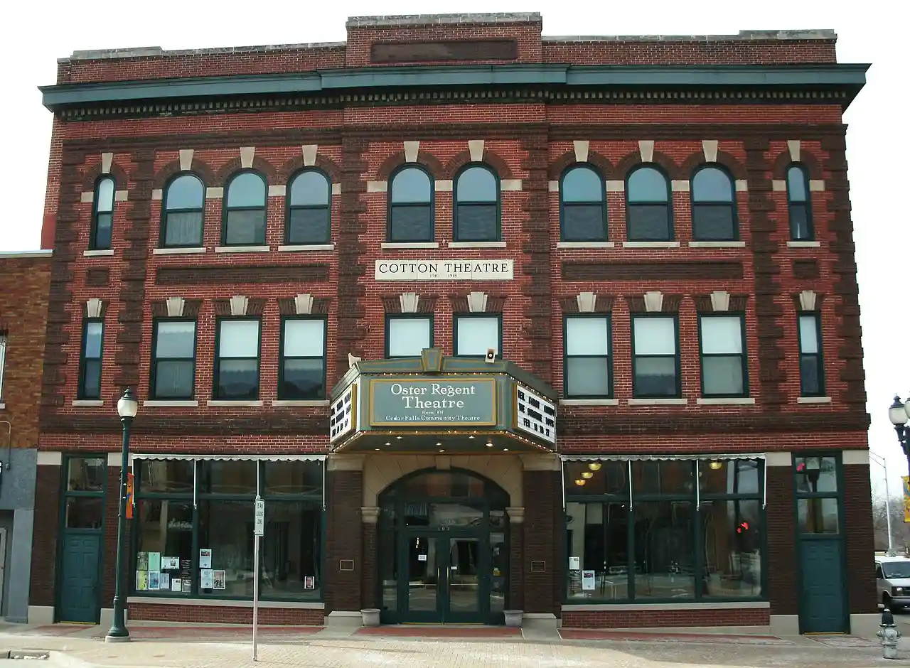 The Cotton Theatre, also known as Regent Theatre and Oster Regent Theatre, is a theater located at the corner of 1st Street and Main Street in downtown Cedar Falls, Iowa, United States. It was named for local Cedar Falls resident Frank Cotton who built the theater in 1909 and 1910. Read more on Wikipedia