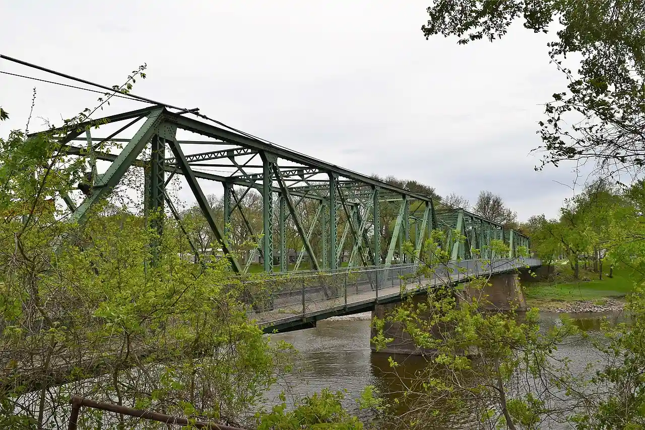 The Third Street Bridge, also known as the Brookwood Park Bridge and the Harmon Street Bridge, is a historic structure located in Waverly, Iowa, United States. It spans the Cedar River for . This Riveted Pratt through truss was designed by the Iowa State Highway Commission and constructed by the Illinois Steel Bridge Company of Jacksonville, Illinois in 1917. It is composed of three spans. The truss' were painted green in 1962, and the bridge received major renovations in 1983. It was closed to traffic in February 2015 "after a certified inspector examining the bridge Friday for an annual inspection found the trusses connecting bearings, sidewalk support brackets, and two stringers in the south bridge span have severely corroded." It was listed on the National Register of Historic Places in 2018. The Third Street Bridge is one of three bridges installed by the Illinois Steel Bridge Company that is still standing in Iowa. Read more on Wikipedia