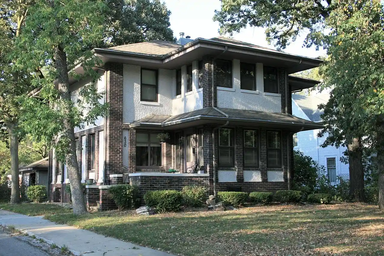 The Chris Rye House is a historic building located in Mason City, Iowa, United States. Rye was a local contractor who built this Prairie School influenced house for his family. He may have designed it as well. with Rye was responsible for constructing many of Walter Burley Griffin's houses in the Rock Crest – Rock Glen development, as well as other buildings in north-central Iowa. The exterior of the two-story house is a unique combination of brick and stucco, and it's capped with a hip roof. It was listed on the National Register of Historic Places in 1980. Read more on Wikipedia