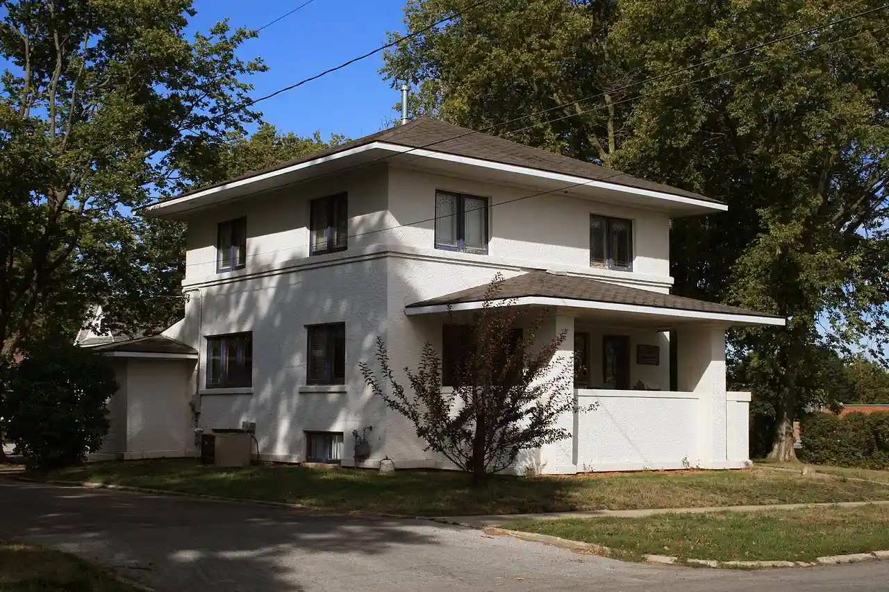 The E.R. Gibson House is a historic building located in Mason City, Iowa, United States. Built in 1912, this two-story stucco structure exhibits a strong Prairie School influence. with It features a wide eaves, hip roof, a central chimney, and casement windows of leaded glass. The house was listed on the National Register of Historic Places in 1980. Read more on Wikipedia