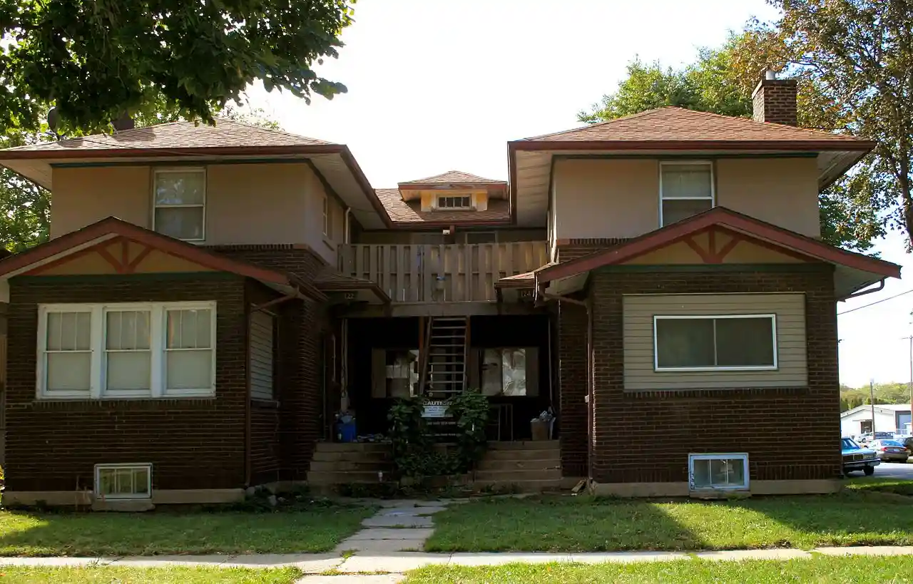 The Lippert House is a historic building located in Mason City, Iowa, United States. Built in 1923, this two-story duplex is significant for its C-shaped plan and strong Prairie School influences. with It features brick on the first floor, stucco on the second, wide eaves, broad hip roof, and a common utility wall. The house was listed on the National Register of Historic Places in 1980. Read more on Wikipedia