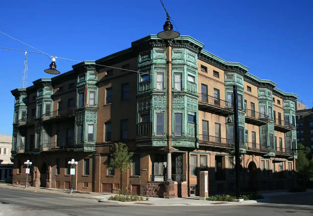 The Kirk was a historic building located in Mason City, Iowa, United States. Completed in 1903, this was the city's first luxury apartment building. with Horace P Kirk, who owned and managed the building, was a Mason City businessman, photographer, and civic leader. He built two other buildings here and to the north that were destroyed in a fire in 1902. This building was built on the site of Kirkland Flats, and parts of its stone foundation and north wall may be from the H.P. Kirk wholesale building that had been built in 1892. Originally The Kirk supplied heat, light, and water for the apartments with its own steam generating plant. It subsequently acquired city utilities. The building featured an eclectic design that was organized into horizontal and vertical elements. The horizontal was realized in wide brick bands on the floors. The vertical was realized in the copper-clad oriel windows that tied the second and third floors to the cornice. The building was individually listed on the National Register of Historic Places in 1982, and as a contributing property in the Mason City Downtown Historic District in 2005. with Read more on Wikipedia