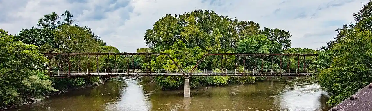 The Adel Bridge is located on the east edge of Adel, Iowa, United States. The span carried traffic on River Street over the Raccoon River. The Dallas County Board of Supervisors received a petition to replace a deteriorating bridge at this location. The old bridge had been built where ferry service had been initiated in 1850, three years after the town had been established. They contracted with the King Iron Bridge and Manufacturing of Cleveland to build the two-span Pratt through truss bridge for $12,500. It was a primary river crossing into Adel until 1932 when the U.S. Highway 6 bridge was completed not far to the south. While it remains in place, it was closed to vehicular traffic in 2000. The bridge was listed on the National Register of Historic Places in 2002. Read more on Wikipedia
