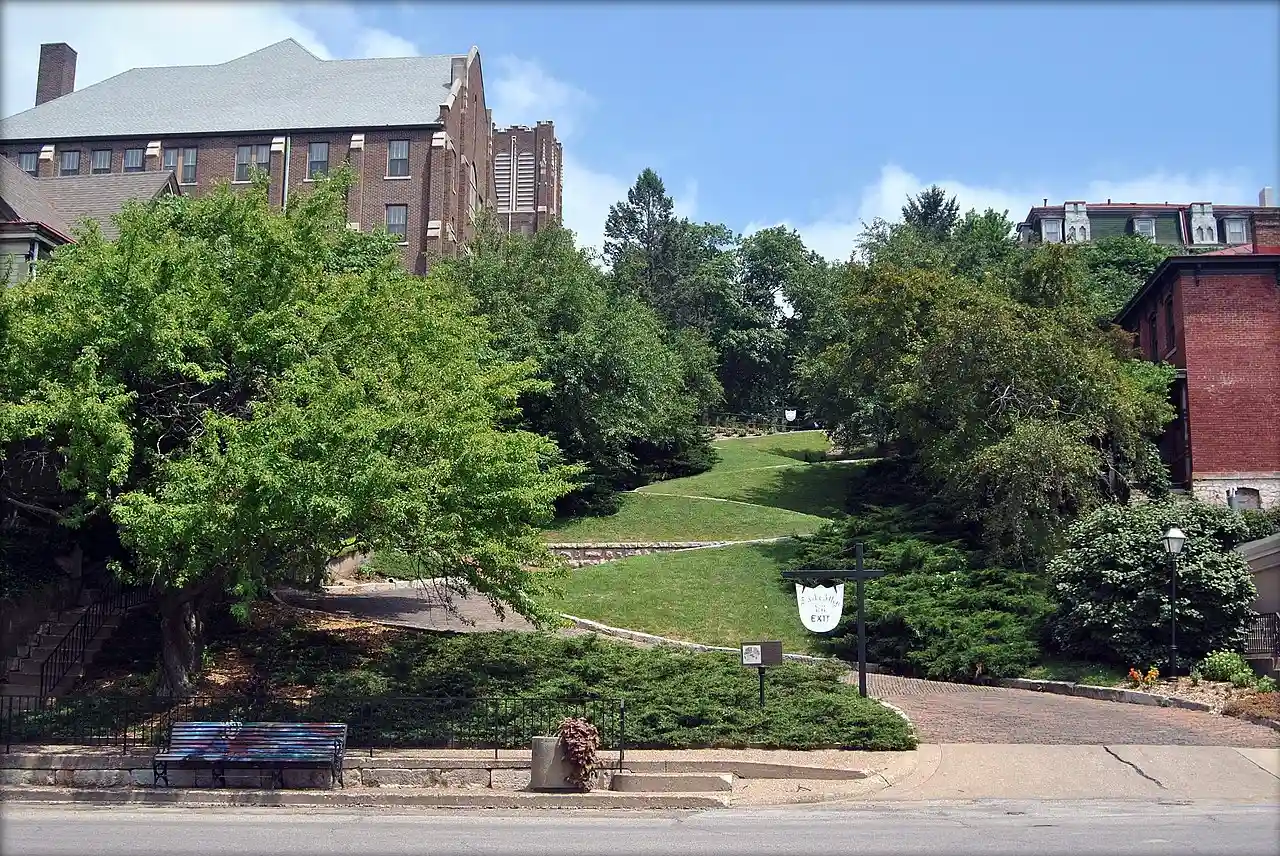 The Snake Alley Historic District is a nationally recognized historic district located in Burlington, Iowa, United States. It was listed on the National Register of Historic Places in 1975, and it was included in the Heritage Hill Historic District that surrounds it, in 1982. The historic district is largely a residential area that includes ten contributing properties. with It is centered on Snake Alley, a brick roadway built in 1894 that rises from Washington Street to Columbia Street. The alley receives its name from the five half curves and two quarter curves that climb the hill. Cobblestone Alley is the eastern boundary of the district. It is a very steep roadway composed of large, limestone blocks. Six houses, built between 1845 and about 1880, surround Snake Alley. Schwartz' Auto Electric Service building and the First United Church of Christ complex round out the contributing buildings. Read more on Wikipedia