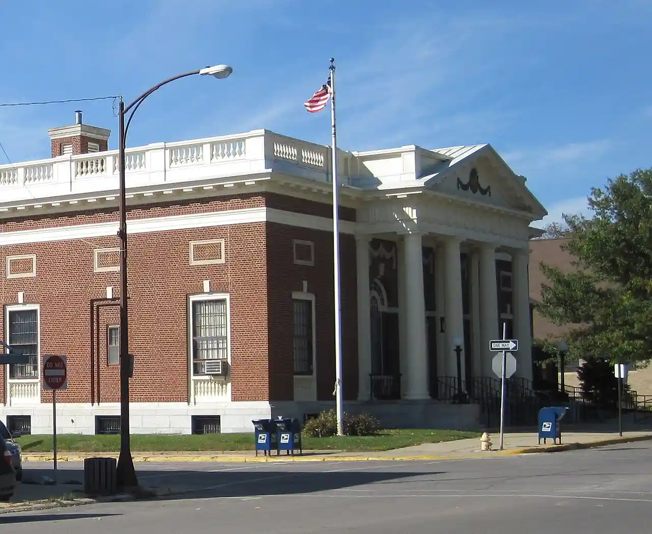 The United States Post Office is a historic building located in downtown Iowa Falls, Iowa, United States. Built in 1914, the structure was designed in the Neoclassical style, with Oscar Wenderoth as the supervising architect. The 1893 Colombian Exposition in Chicago was a major influence in the building's design. The foundation is composed of North Carolina granite, while the walls are dark red brick that is laid in an English cross bond. The main entrance is framed by a portico that is held up by four columns of the Doric order. The interior features woodwork of white oak, a marble-terrazo floor, and a vaulted ceiling. It was listed on the National Register of Historic Places in 1994. Read more on Wikipedia