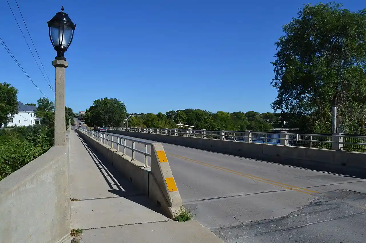 The Washington Avenue Bridge in Iowa Falls, Iowa is an attractive concrete two-span open spandrel arched bridge that brings Washington Avenue over the Iowa River. Originally it carried US 20. It was built in 1934 by the Weldon Brothers for $51,710.55. Read more on Wikipedia