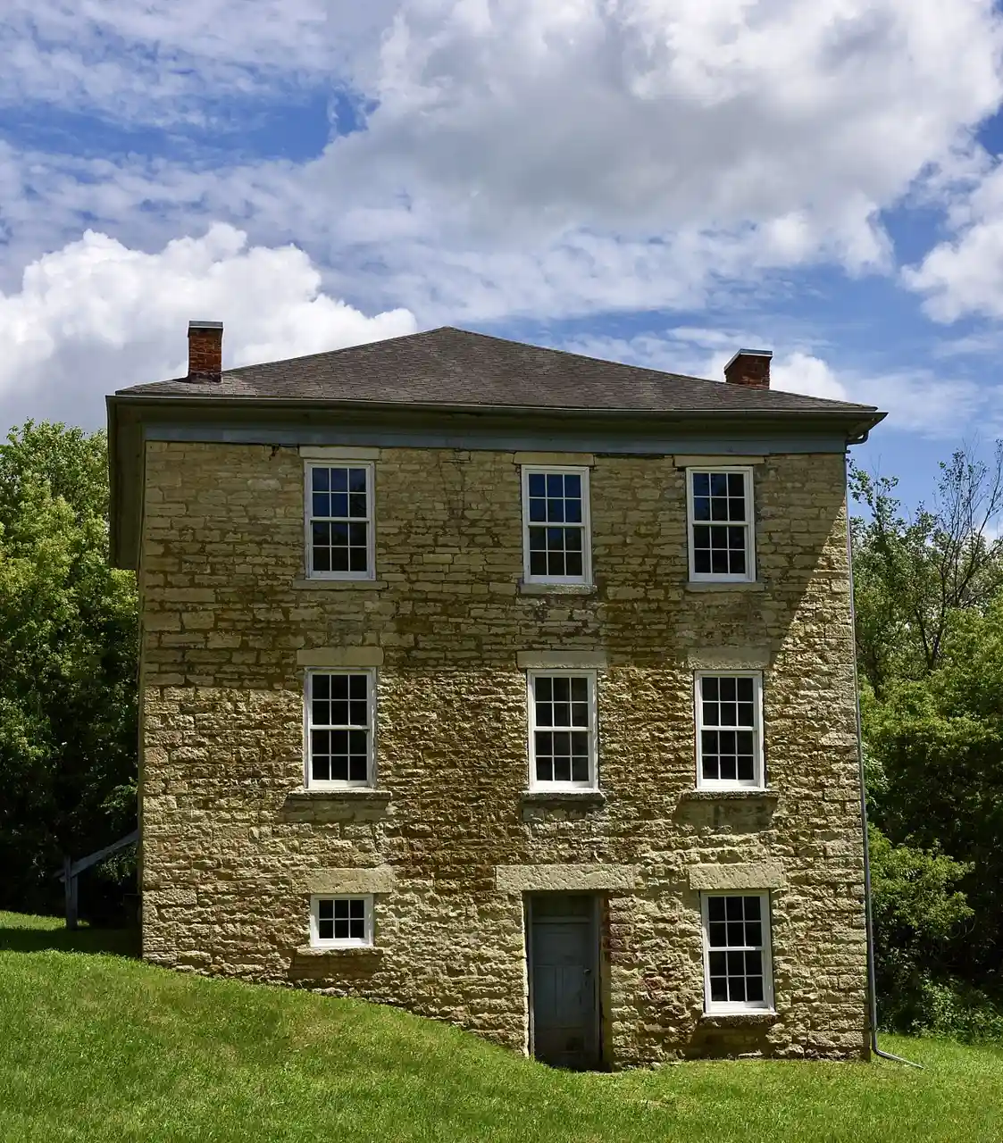 Big Mill Homestead is a historic residence located west of Bellevue, Iowa, United States. It is one of over 217 limestone structures in Jackson County from the mid-19th century, of which 101 are houses. This is one of 12 houses with a hip roof. with It was built around 1850 into the side of a hill, so the south elevation has three floors and the north elevation has two. The cube-shaped structure features cut coursed stone with blocks of various sizes and shapes, and limestone sills and lintels. There is no indication that this house was ever stuccoed, as several in the vicinity were. The house was listed on the National Register of Historic Places in 1991. Read more on Wikipedia